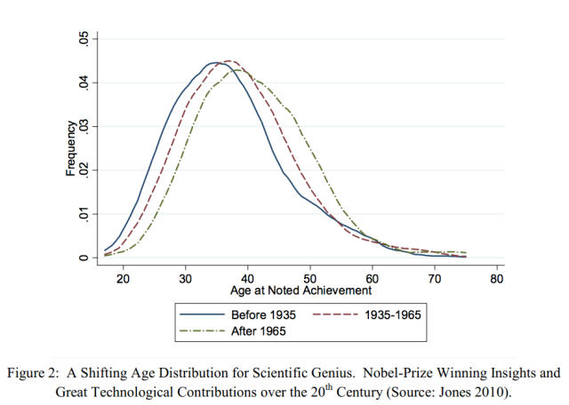 A 2000-es évektől időről időre tért nyert az ageism, azaz a fiatalabbak pozitív diszkriminációja, elsősorban az ICT-befektetések területén. Erről visszatérő vitánk volt az egyik kedvenc csapatunkkal, akik akkoriban szemtelenek és fiatalok, szemtelenül fiatalok voltak, és ezzel egy haranggörbe legszélén helyezkednek el sikeres huszonévesként. Miért kardoskodtunk mi mégis amellett, hogy a befektetőknek és policy-gyártóknak vigyázó szemeiket a 32-40-es nemzedék felé kellene forgatniuk? Nézd meg, hogyan alakultak életkor szempontjából a Nobel-díjak és a nagy technológiai újítások az elmúlt évtizedekben.