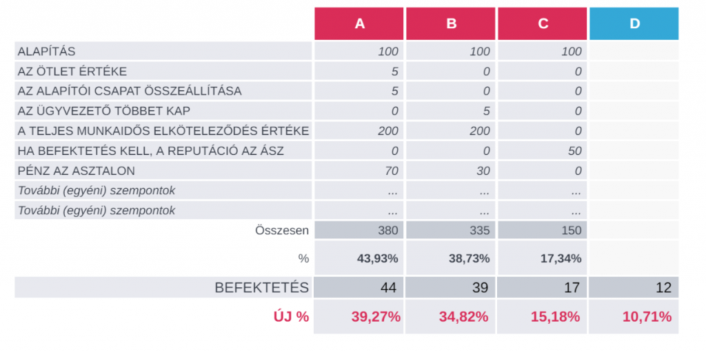 Ez a számítás persze csapatonként, cégenként finomítandó – de aránylag pontosan mutatja, valójában ki mennyit tesz bele. Ez itt az alapítói százalékok megosztása.