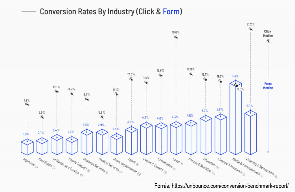 Azt állítjuk, hogy a marketing helyes eszközei iparáganként, ügyfélszegmensenként differenciáltak, és néhány alapvető igazságon túl nincs mindenkire alkalmazható generálmegoldás. Honnan tudhatod, hogy igazat mondunk? Mutatunk adatot. Az alábbi ábrán azt fogod látni, hogy a landing page, azaz az oldal, amelyre a látogatód megérkezik, iparáganként eltérő mértékben konvertál. Ha mindent jól csinálsz, akkor is. Ha átlagos vagy, akkor is. Íme: